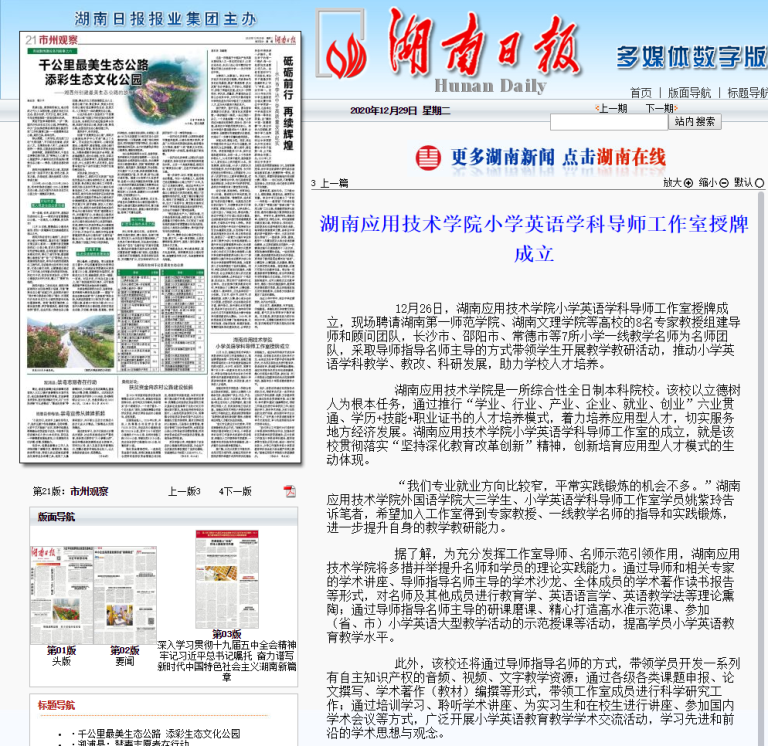 1. (湖南日报)湖南应用技术学院小学英语学科导师工作室授牌成立(新闻来源:https://hnrb.voc.com.cn/hnrb_epaper/html/2020-12/29/content_1494600.htm)2. (《新湖南》主流新媒体)“湖南应用技术学院小学英语学科导师工作室”授牌仪式的新闻(新闻来源:https://m.voc.c…