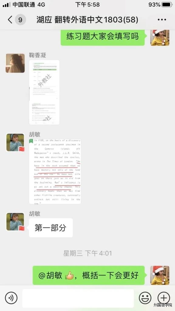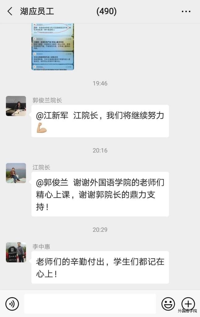 在这段期间,我院涌现出这样一群老师,默默无闻、良师益友。她们利用QQ、微信、慕课、爱课堂等等网络学习平台督促、引导学生学习,期中有老师汪奇文、老师杨华丽、老师曹新宇、老师张霞辉、老师毕烁、老师陈梅、老师肖文林、老师黄珊等等。特别是我院老师熊子瑜,她教授我校文化传媒学院中文1803班的大学英语,同学们亲切的称熊子瑜为——学子们的“南丁格尔”;“桃李灼灼春风里,寸心微微难言著”这是中文19103班同学们给教授她们大学英语的汪奇文的高度赞美。