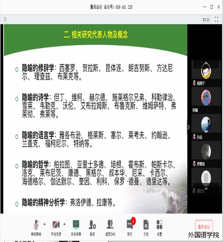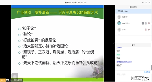 为了提高教师们教学改革和科学研究的能力,2020年3月28日,外国语学院通过腾讯会议召开了陈勇教授“中美政治隐喻研究”报告会及教改科研项目申报研讨会。