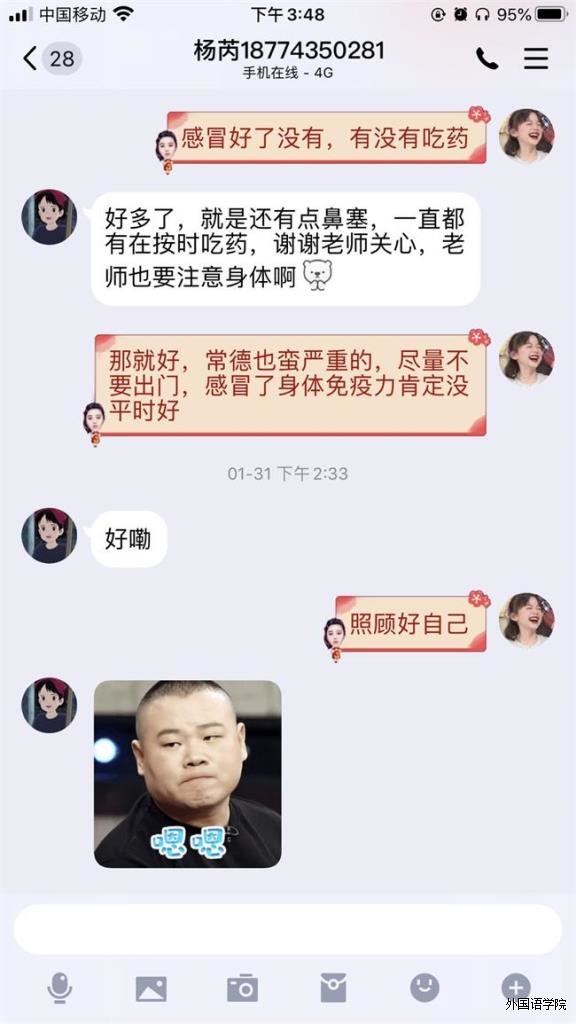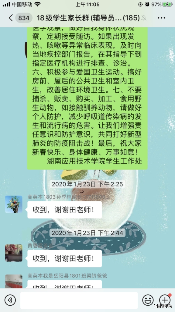 这是外国语学院田莉老师的“战疫日记”,假期期间,她时刻关注着大家的身心安全和学习生活两个方面。我们知道 ,战疫情,辅导员老师与我们在一起!