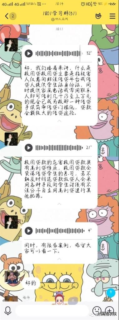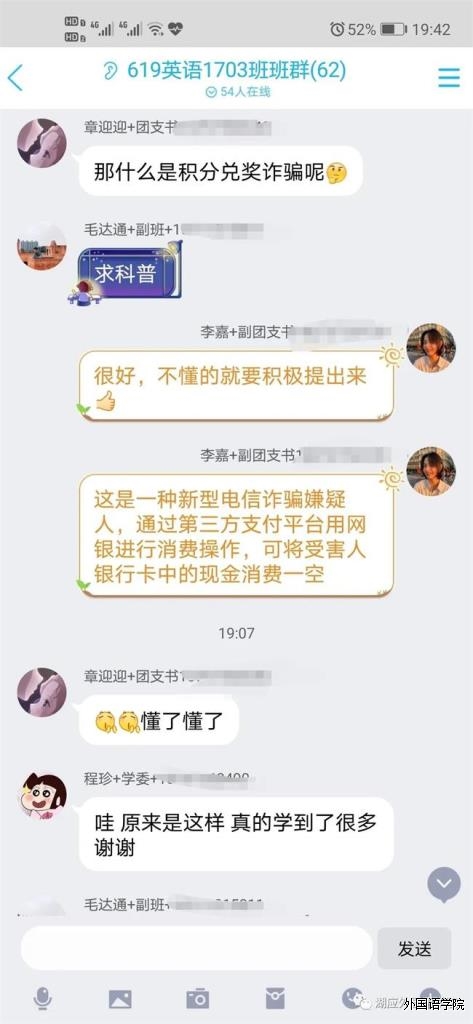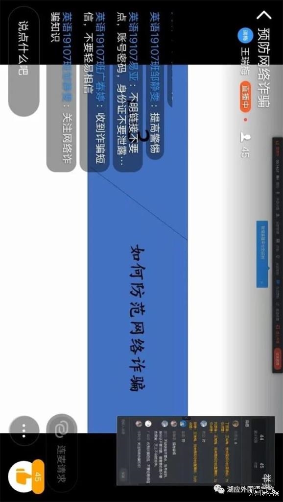 针对上述现象,外国语学院于2020年4月21日开展“预防网络诈骗”线上主题班会,围绕加大电信诈骗、网络贷款宣传力度,借助外力(案例)增强防骗、防贷宣传力度以及重点宣传,增强防骗、防贷宣传的针对性三个方面开展此次主题班会。
