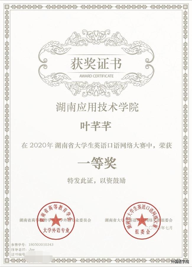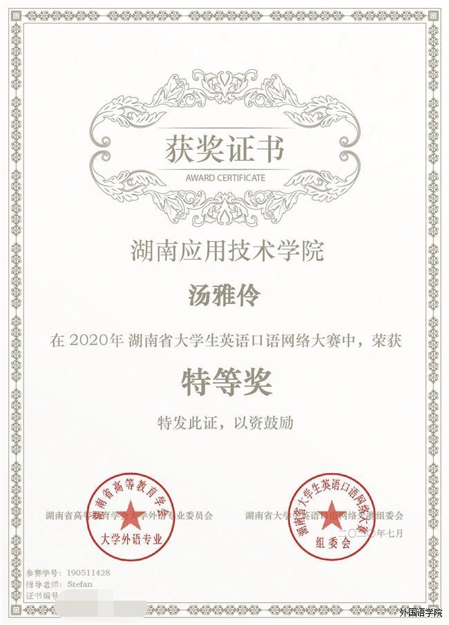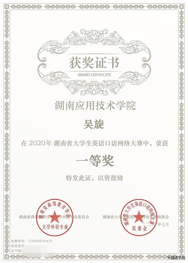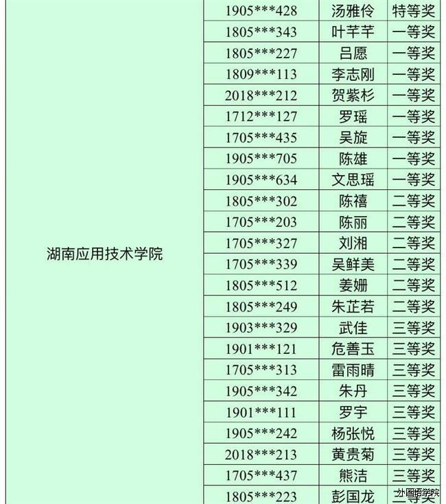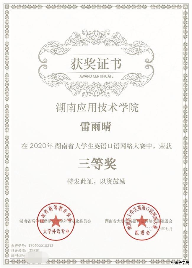 热烈祝贺我校优秀学子在“湖南省第三届大学生英语口语网络大赛”中取得优异成绩。其中我院汤雅伶荣获特等奖!叶芊芊、吕愿等6位同学荣获一等奖!陈禧、姜珊等5位同学荣获二等奖!黄贵菊、熊洁等6位同学荣获三等奖!