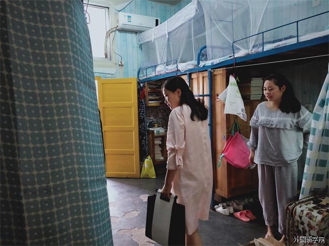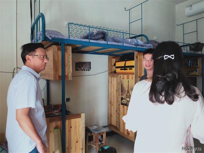 随后来到了47栋男生寝室,与男同学们话起了家常,说到外国语学院男生较少,男同学们要更有担当,
