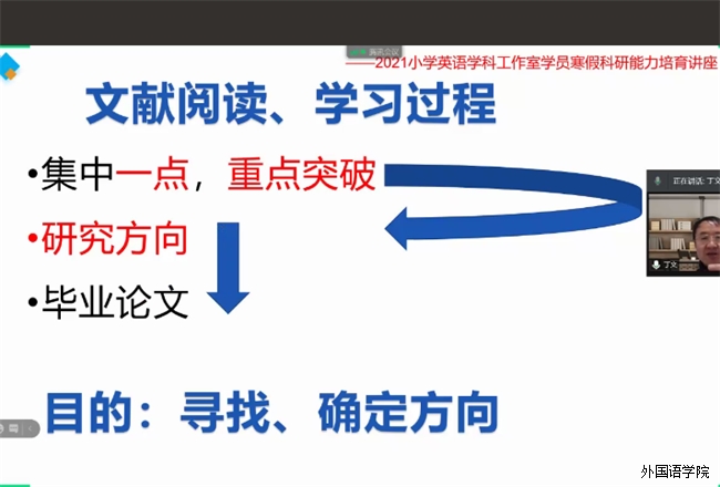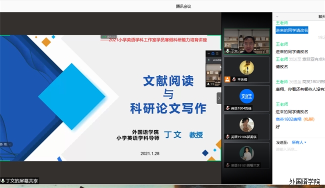 为了提高工作室学员的科研能力水平和专业素养,为学生营造良好的学术氛围,2021年1月28日晚上,工作室导师丁教授在腾讯会议为工作室卓越学员开展题为《2021年小学英语学科工作室寒假科研能力培育》的讲座。