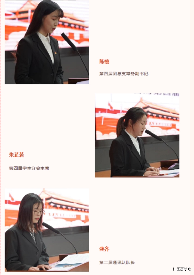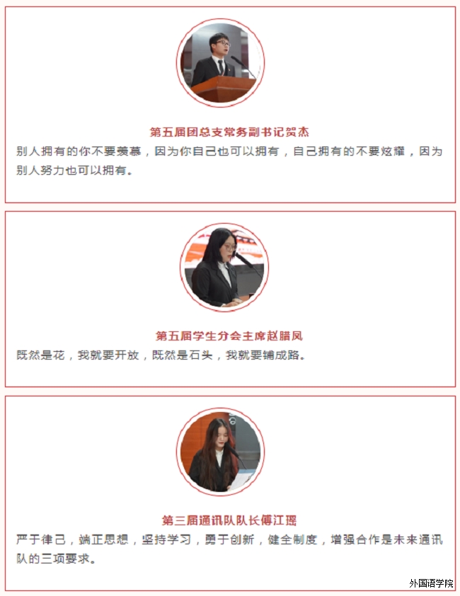 外国语学院院长助理张波宣读新一届上任干部名单,由外国语学院党总支副书记宋河林、外国语学院院长助理张波、校团委副书记左得分别为新任干部颁发任职证书。证书颁发完毕后,由新任干部代表第五届团总支常务副书记贺杰、第五届学生分会主席赵腊凤、第三届通讯队队长傅江瑶上台发言并就未来相关工作进行说明。