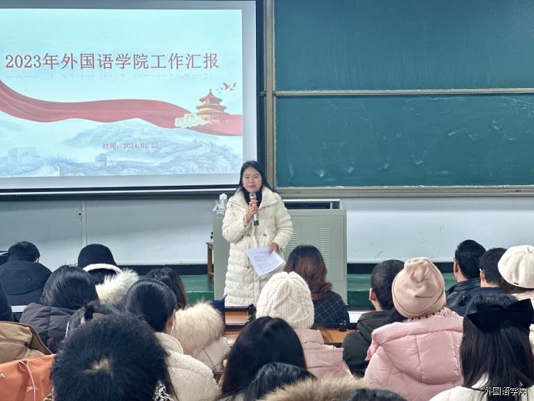 外国语学院2023年度工作总结大会于2024年1月22日在A3-307阶梯教室顺利召开。会议由外国语学院教学副院长王中兰主持,外国语学院全体教师参加会议。