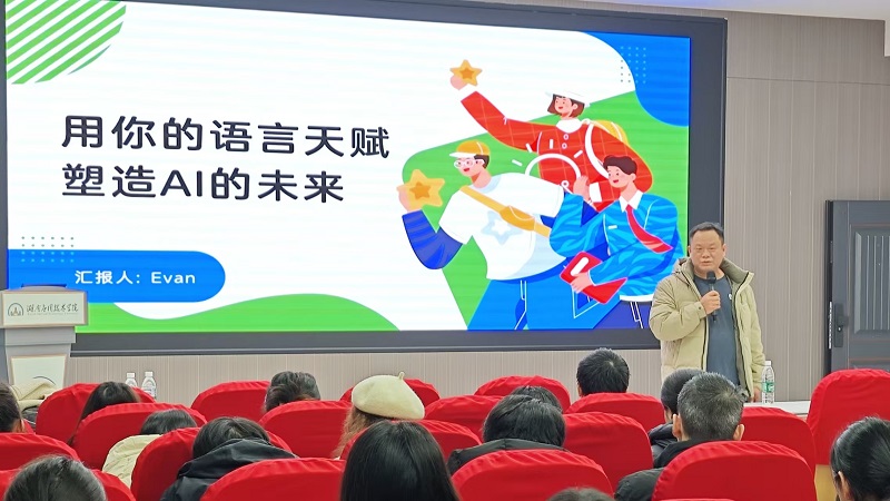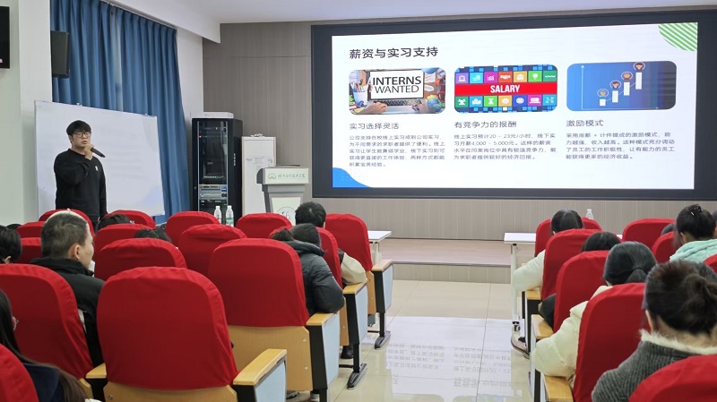 宣讲中,外国语学院党总支副书记张波结合就业形势,立足学院人才培养需求,勉励学子摒弃专业认知顾虑,理性调整就业期待,树立正确择业观;智柚科技总经理详解英文数据标注项目核心内容,强调岗位对提升英语与AI协同能力的作用;该公司张老师结合实习要求,为学生提供针对性指导。