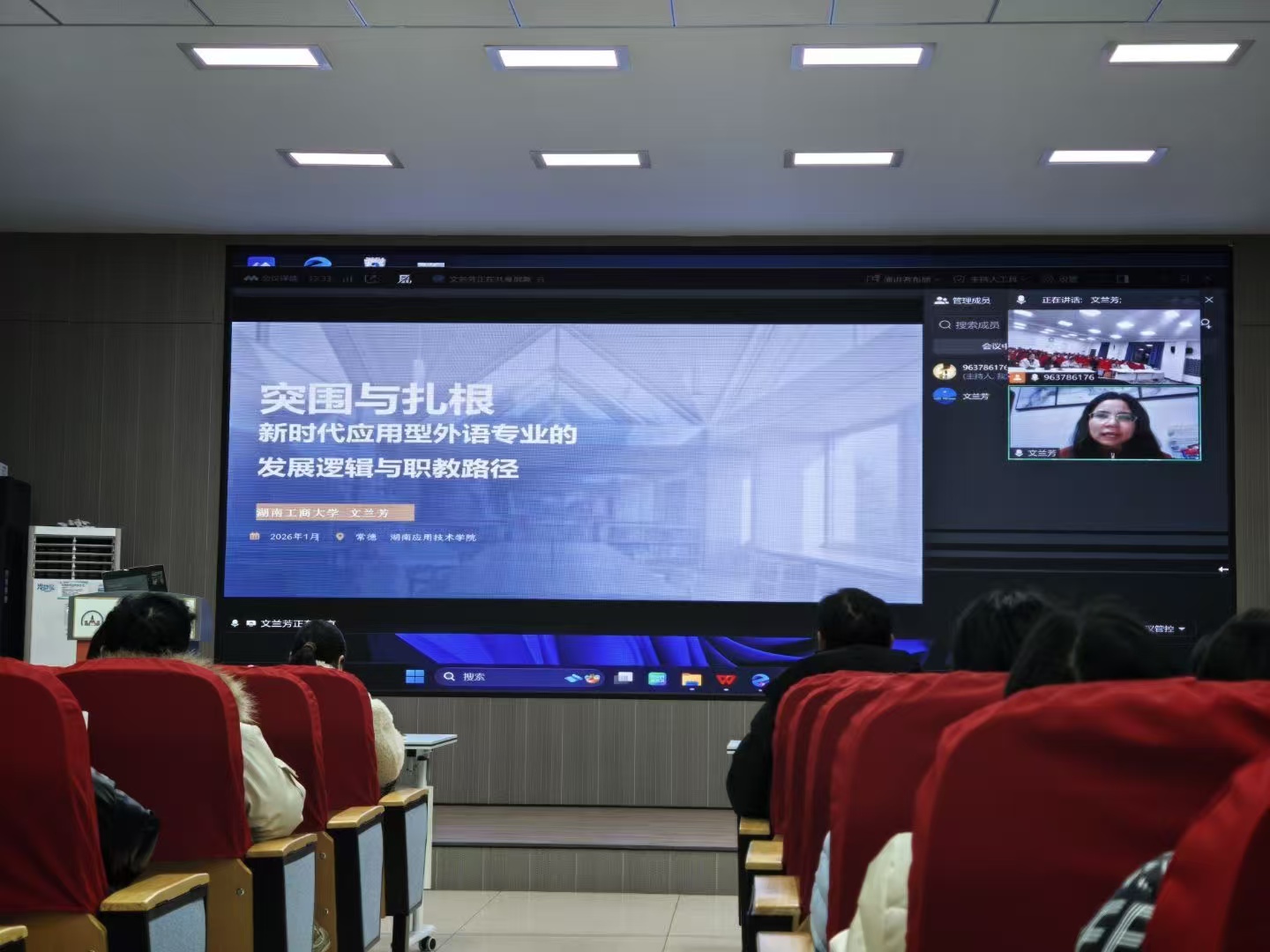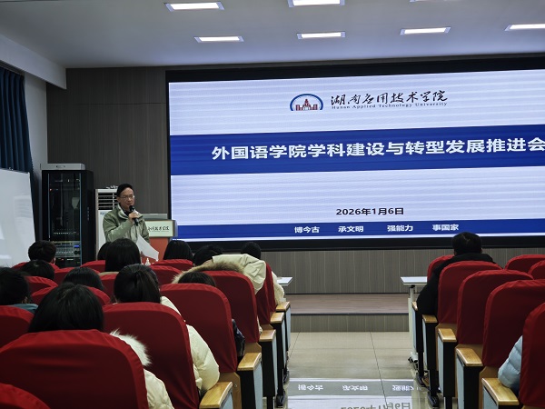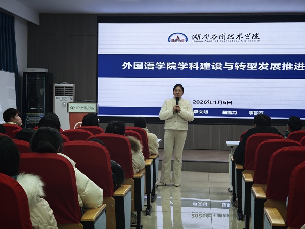 2026年1月6日,外国语学院召开学科建设与转型发展推进会,学院领导及全体教职工出席,湖南工商大学文兰芳教授应邀作专题分享。