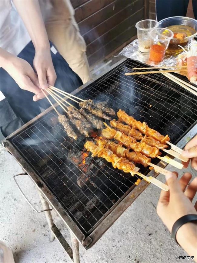 夕阳西下,美景配美食,我们一边拍照一边烧烤。炭火烧得太慢,烤架上的烤肉不能满足饥肠辘辘的我们。于是乎,拿着碗和筷子,焦急的等待着,时而去其他小组看看,顺便蹭点吃的。一串烤肉,一人一口,一个红薯,一起分享,其乐融融。这或许就是青春年少的我们吧,有分享,有快乐。