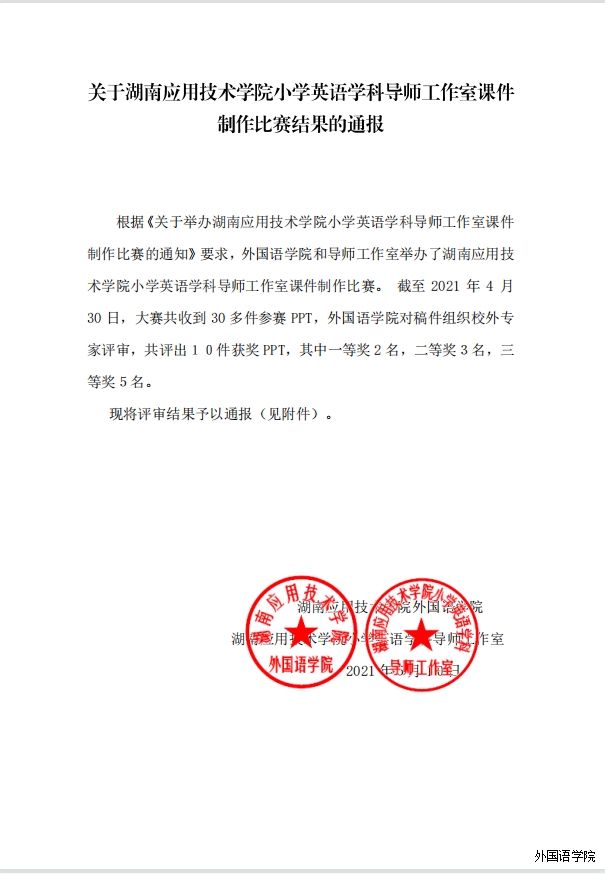 附件:关于湖南应用技术学院小学英语学科导师工作室课件制作比赛结果的通报.pdf